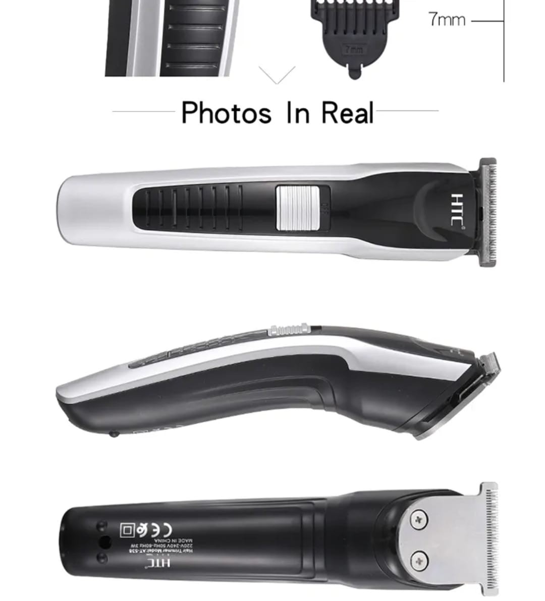 বক্সে যা যা পাবেনHTC AT-538 ট্রিমার (মূল ডিভাইস)চার্জিং ক্যাবল৪টি চিরুনি কম্ব অ্যাটাচমেন্ট – 1mm, 3mm, 5mm, 7mmলুব্রিকেশন অয়েল (ব্লেড মেইনটেন করার জন্য)ক ব্রাশ (ব্লেড পরিষ্কারের জন্য)ইউজার ম্যানুয়াল / নির্দেশিকা বইে।